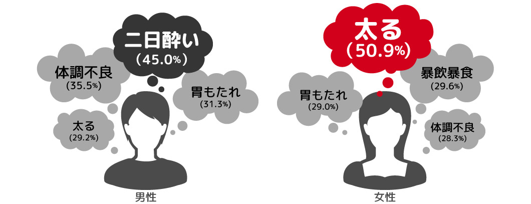 飲み会や外食時、体調面で気になることは「太る」「二日酔い」「体調不良」「胃もたれ」