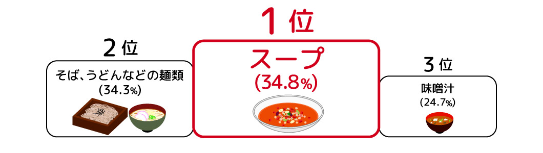 飲み会や外食が続いた翌日に食べたいランチは、「普段より胃にやさしいもの」「普段よりあっさりしたもの」などが上位に。具体的なメニューは、スープ、うどんやそばなどの麺類、味噌汁など、温かいメニューが好まれているようです。