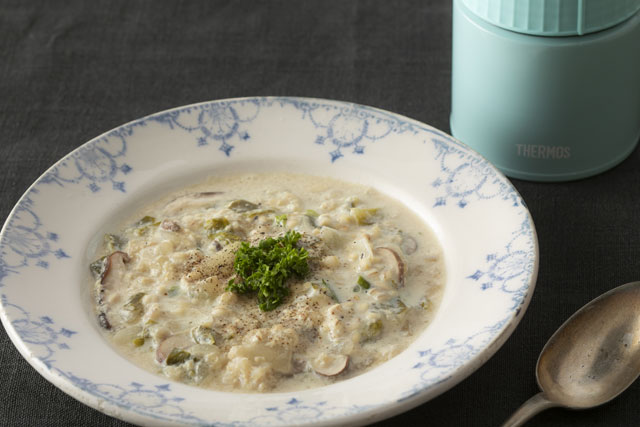 今回は鍋を使ったレシピを紹介しましたが、「白かゆならスープジャーに大さじ2の米を入れ、沸とうしたお湯を注ぎ2分程予熱。一度湯切りしたら、再び沸とうしたお湯を入れて3時間保温するだけでおかゆが出来上がります」と鍋を使わずにスープジャーだけでできるシンプルな白かゆの作り方も野上先生に教えていただきました。