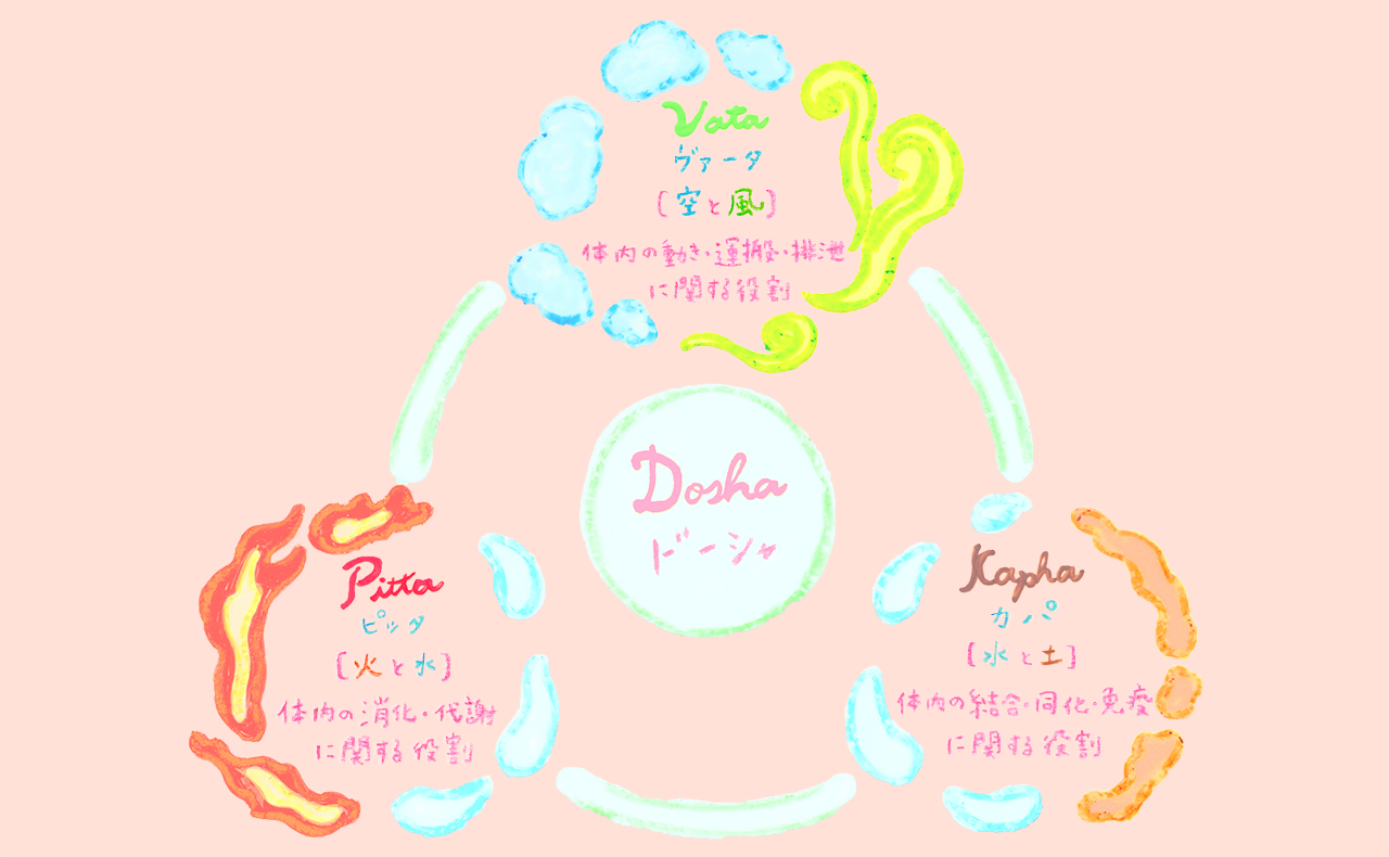 「アーユルヴェーダでは、人間はみな<ドーシャ>と呼ばれる生命エネルギーを持っています。ドーシャは、〈ピッタ(火)〉〈ヴァータ(風)〉〈カパ(水)〉の3要素でできており、これら3要素のバランスが取れている状態こそが理想ですが、人によってピッタが強い、ヴァータが強いなど持って生まれた体質はさまざま。その点、3要素をすべて併せ持つ白湯はどんな体質の人にもぴったり合い、足りない要素を補ってくれる飲みものだといわれているのです」(以下、関先生)