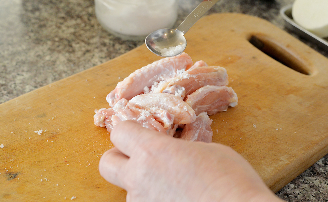 手羽スペアリブはだしが出やすく、そのままホロホロおいしい具材になっちゃいます。塩をもみこんだら15分ほどおいてなじませるのがコツ。