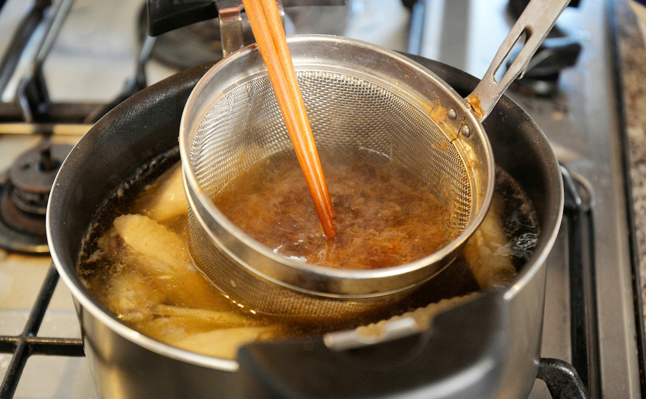 【3】弱火にして、削り節を味噌こしに入れ、1〜2分加熱して火を止める。
