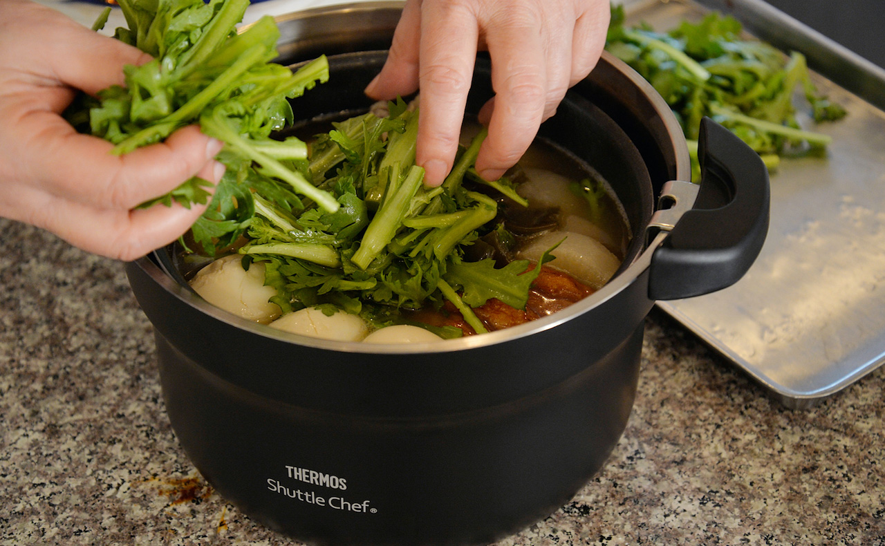 【2】調理鍋を保温容器に入れてフタを閉め、1〜2時間そのままおいておく。食べる直前に春菊を入れ、くたっとしたら完成!