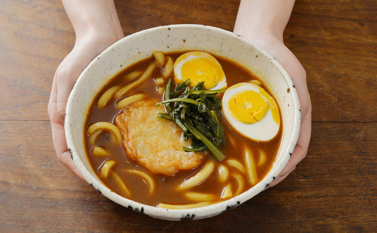 おでんの残りダシ(700ml)に削ったカレールー(30〜50g)を溶き、めんつゆ(適量)をひとまわし。うどん(2玉)を入れて茹でたら完成!