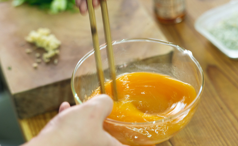 玉子焼きの好みや作り方のちょっとしたコツを教えてもらったところで、サーモスの玉子焼きフライパンを使って、玉子焼きを作っていただきました。