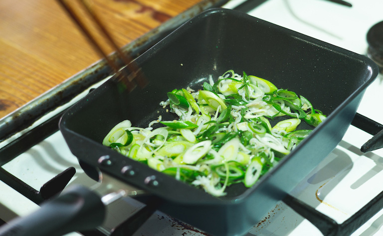 「おかずのプラス1品で作ることが多いですね。友人が遊びに来たときに、テーブルにカセットコンロを出して目の前で作ったりもします。ジュワ〜っと焼ける音だったり、玉子焼きをひっくり返す様子だったり、すぐ作れるのにライブ感満載なので喜んでもらえるんですよ。」