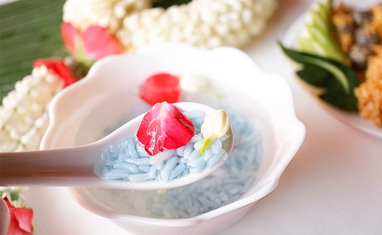 日本と違い、タイのお正月は4月の暑い時期に祝うもの。涼しげで香り高いカオチェーは、たくさんのおかずと共に食されるお節料理の一つです。