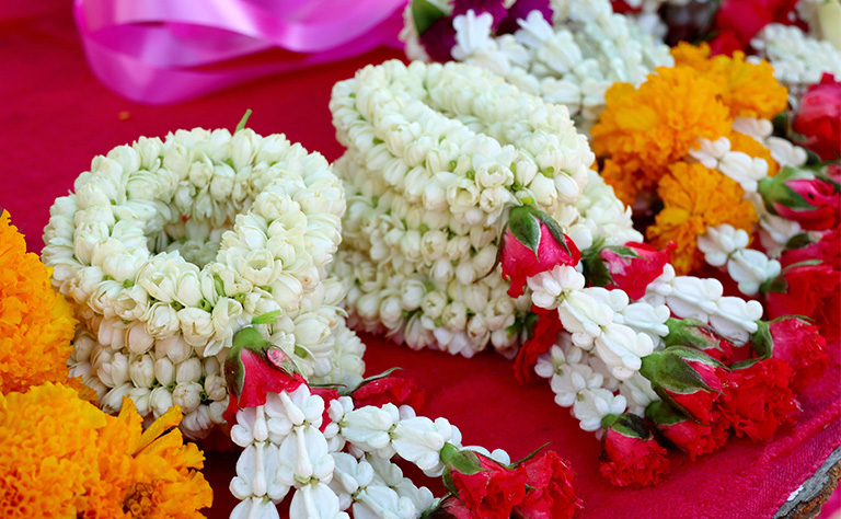 純白の花で作った花飾り「マーライ」は、ソンクラーンを始めとするお祝い事や冠婚葬祭、お供え物などに幅広く使われます。また、8月12日のタイの「母の日」には、お母さんに贈る花として人気があるそう。