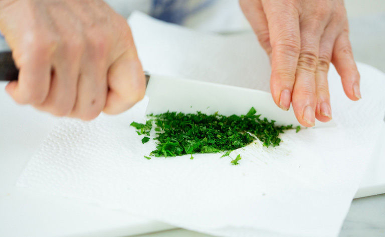 みじん切りにしたミントの葉に、甘酒とレモン汁を加えて、よく混ぜ合わせたら完成! ミントの葉は空気に触れると酸化して黒ずんでしまうので、手早く刻む。