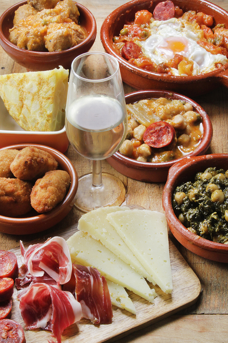 醸造の過程で蒸留酒を加えるため、アルコール度数は15~22%程度と一般的なワインより少し高め。食事を楽しむにはシェリー酒が欠かせません。
