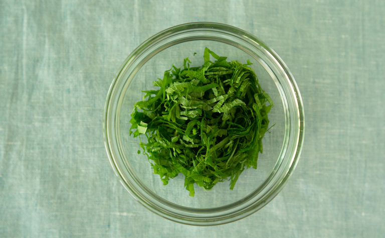 4等分にしてから、葉の裏側を内側にしてクルクル巻いて、千切りにすると楽チン!