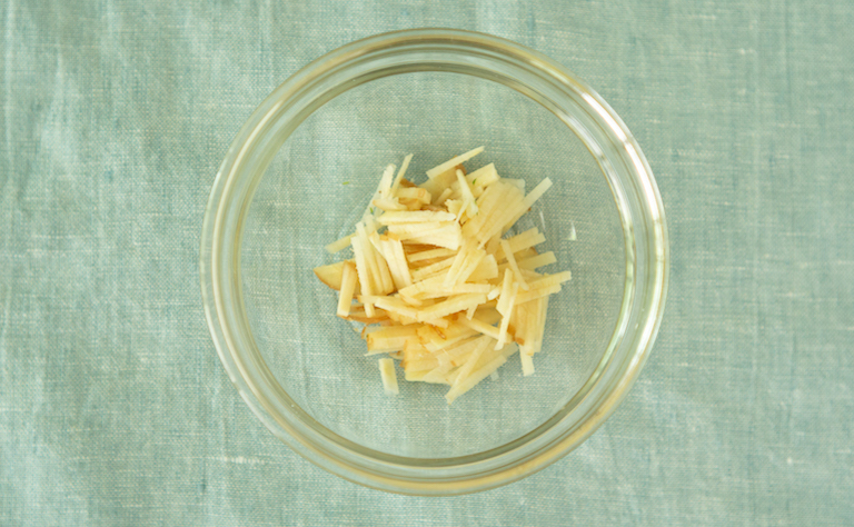 香りの成分がある皮は残して、気になる汚れだけ取り除いて、長さ1cmくらいの千切りにする。香りのよい新生姜でもおいしい。