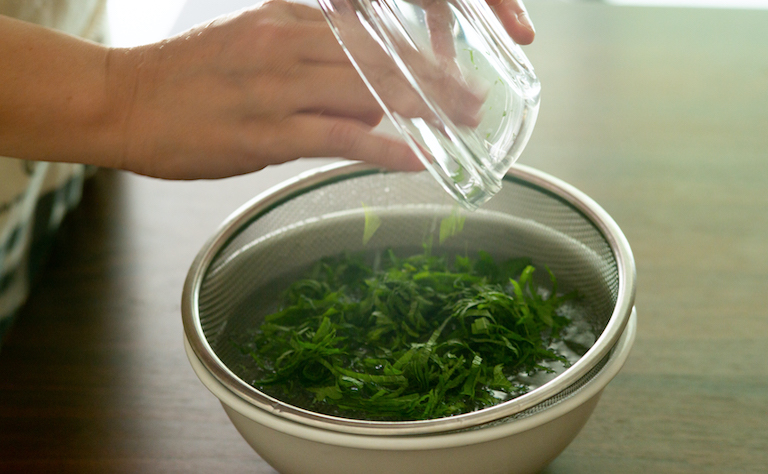 氷水につけることで、余計なアクやエグみが抜けて薬味がシャキっとする。長時間つけると、香りが飛んでしまうので注意する。