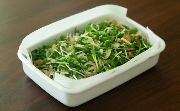 2. 1をザルにあげて水気を切り、乾いたキッチンペーパーを敷いた保存容器に入れる。フタをして冷蔵庫で保存。5日ほどで食べ切る。