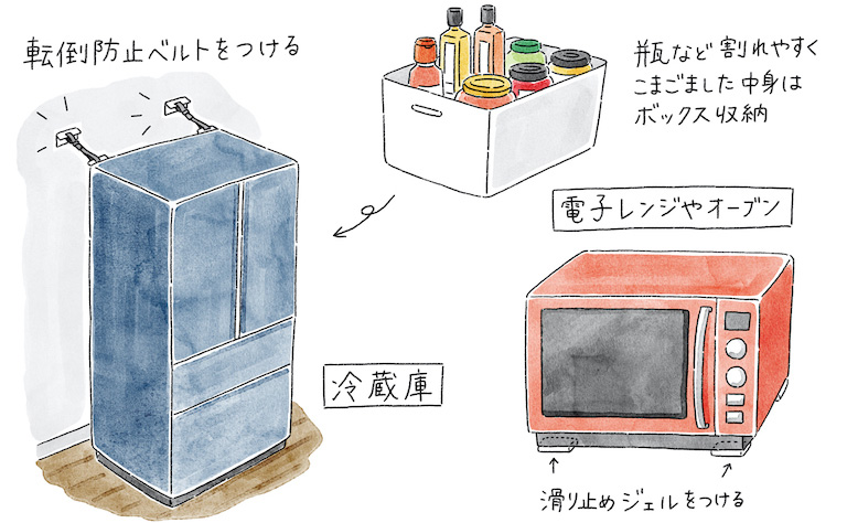 あと冷蔵庫の中身は、万が一飛び出しても被害が最小限に済むように収納ボックスにまとめるのがオススメです。こまごました調味料などは日頃の使い勝手もよくなると思います。