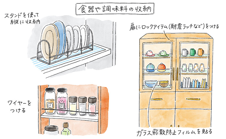まず、食器の下には滑り止めシートを敷きましょう。スタンドを使って縦置きにすれば、割れてしまったときの被害も最小限に抑えられそうですね。食器棚も冷蔵庫と同じように固定して、ガラス面には飛散防止シートを貼り付けましょう。開き扉の場合はロックアイテムをつけると、なお良いと思います。揺れを感知したときだけロックされる耐震ラッチなどがオススメです。