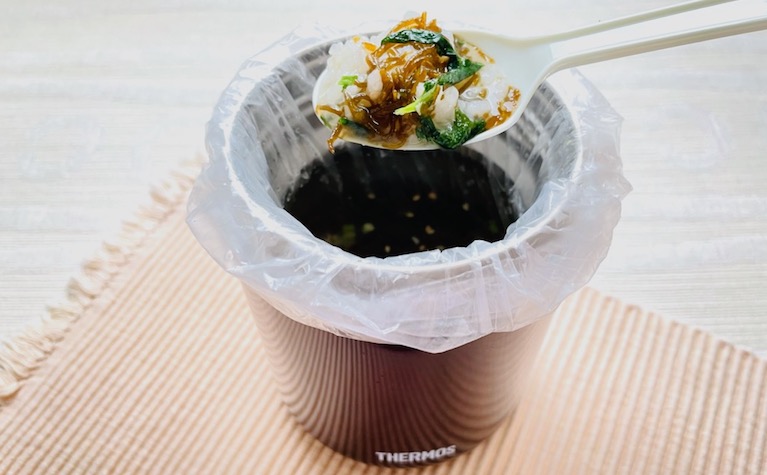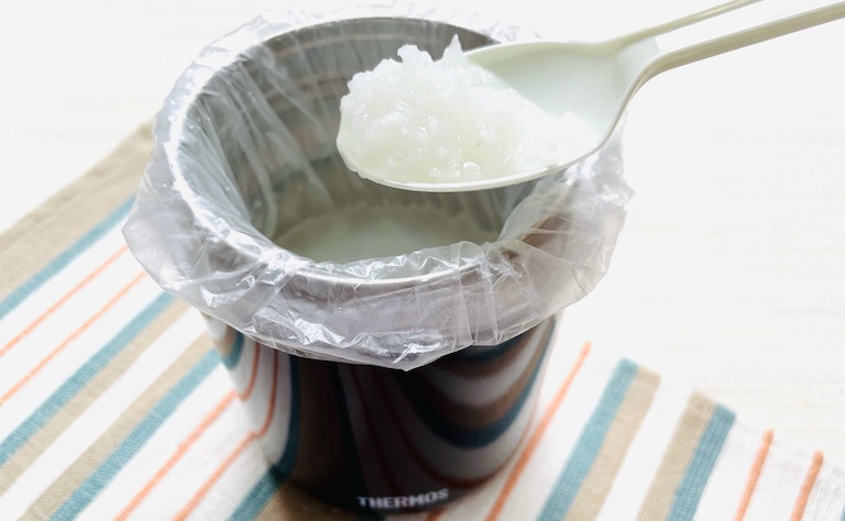 1. スープジャーの中に耐熱性の半透明のポリ袋(高密度ポリエチレン製)をかけ、その中に米を入れ、次に沸騰したお湯を注ぎ、ポリ袋の開け口をねじって中に押し込み、フタをして1時間待つ。