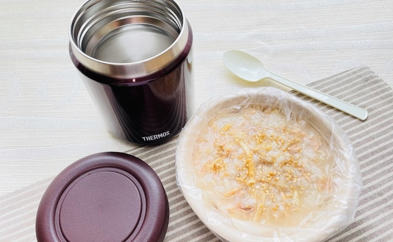 お米の芯を残さないために、必ず熱湯を注いでください。寒いときはスープジャーの温度が下がらないように、タオルなどで包みましょう。