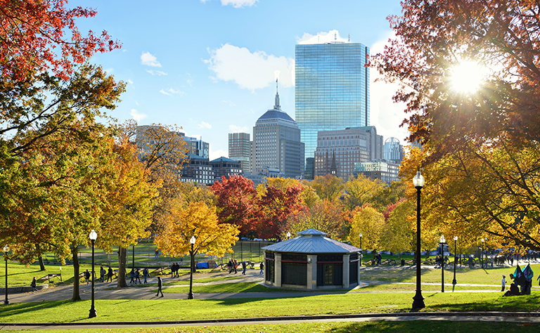 フリーダムトレイルは、アメリカ独立にまつわるスポット16か所をめぐる街歩きです。スタート地点は、ボストン市中心部の広大な公園「ボストンコモン」。ここから赤いレンガのラインが伸びており、それをたどりながら歩くと16か所をもれなく回れる仕組みになっています。