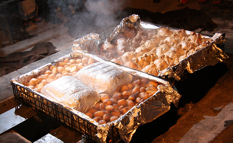 地面に掘った穴に焼き石を敷き詰め、そこに植物の葉で包んだ食材を入れて蒸し焼きにします。現代では、葉の代わりに金属のかごやアルミホイルで食材を包んで蒸し上げる方法もあります。