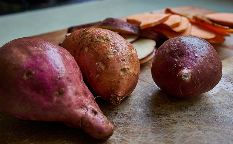 そのクマラを、ややカレー風味に仕上げたのが今回ご紹介するクマラスープです。日本のさつまいもを使って作るので、甘さのバランスを取るために、じゃがいもを少し加えたレシピにしました。甘みの強い味がお好みの方は、全量さつまいもで作ってもOKです。