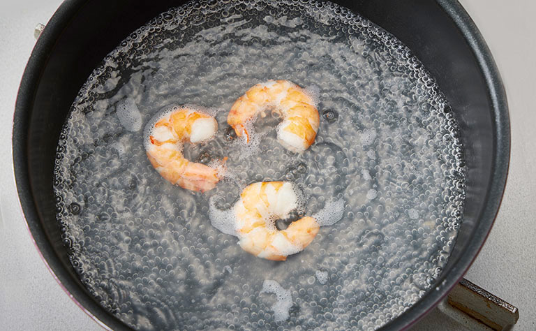 1)水と鶏がらスープの素、えびを鍋で温める。