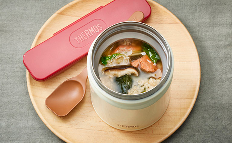 調理のときも、鍋で煮込まずにスープジャーで「保温調理」すれば洗い物もグンと楽に! そのまま保温しておけば、温かいランチにもなります。