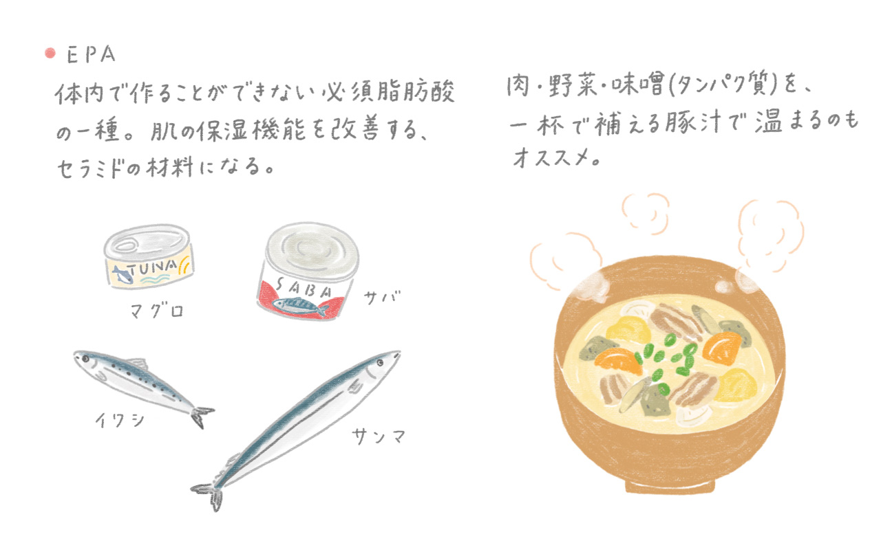 「乾燥肌が気になったら、タンパク質、ビタミン、EPAを意識的に摂取しましょう。味噌は、体を温めながら腸内環境も整えて代謝を上げてくれる乾燥改善のスーパーフード。体温が低くなる朝や夜に、味噌汁や肉・野菜がたっぷりの豚汁をいただくのもオススメです」(石原先生)