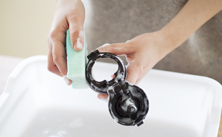 2) やわらかいスポンジと食器用中性洗剤を使って各パーツを洗う。スポンジが入りにくい部分は、小さなブラシなどを使っても◎。