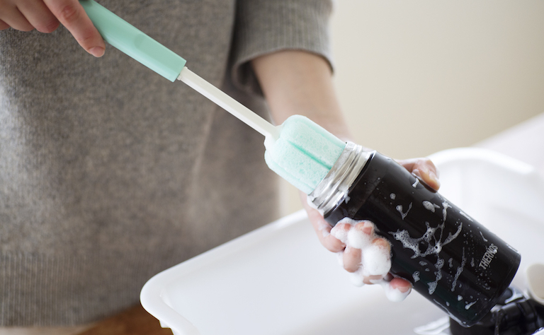 3) ボトルを洗う。柄の長い水筒専用スポンジか箸先にスポンジを取り付けたもので、容器の奥までしっかりこする。