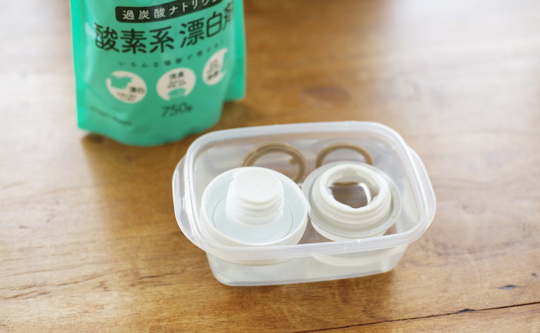 1) プラスチックの容器に漂白液、フタ、飲み口、パッキンを入れて、約30分つけ置きする。