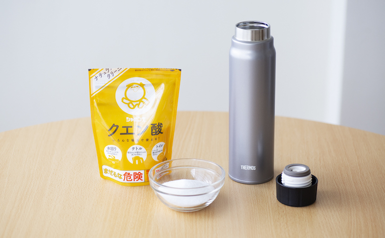 水筒に白くザラザラとした汚れがついていたら、それは水に含まれる「カルシウム汚れ」かもしれません。こちらは酸素系漂白剤ではなく、クエン酸を使って落としましょう。水(1L)に、クエン酸(20g目安)を溶かして専用液を作ったら、2時間目安でつけ置きします。