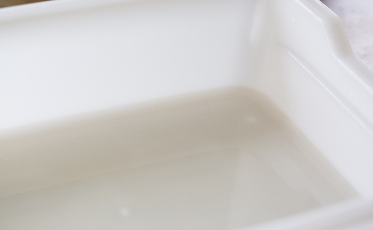 毎日洗っていても、どうしても蓄積されてしまう茶渋やニオイ。これらの対策には、酸素系漂白剤が有効です。30℃〜50℃のお湯(1L)に、酸素系漂白剤(4g目安)を溶かして漂白液を作ったら、30分目安でつけ置きしましょう。週1回のお手入れで、スッキリとした状態をキープすることができます。