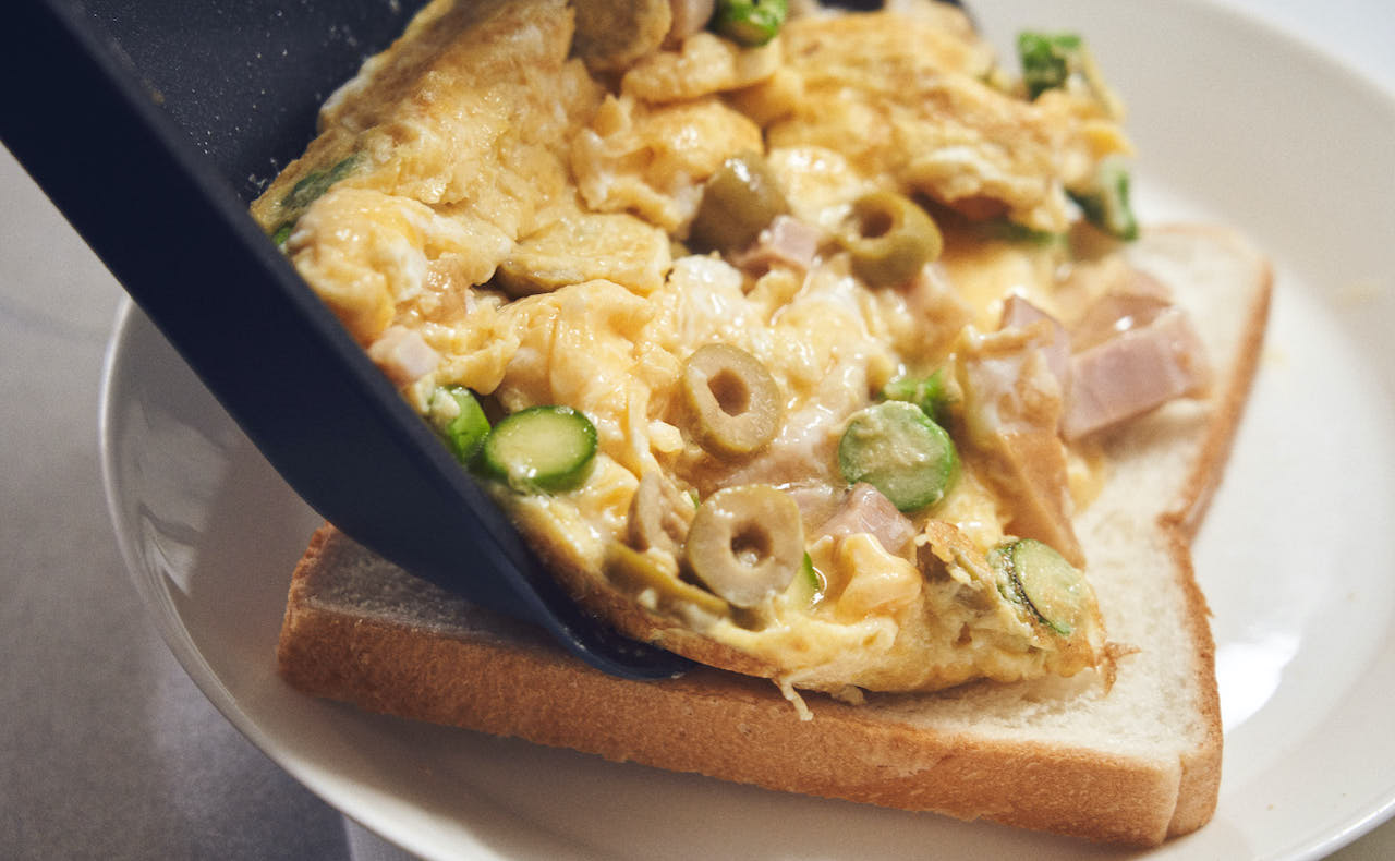 塩気のきいたオリーブが玉子焼きにマッチするんです。ブロックベーコンを使うと、より旨味がアップします。アスパラの食感も楽しいですよ!