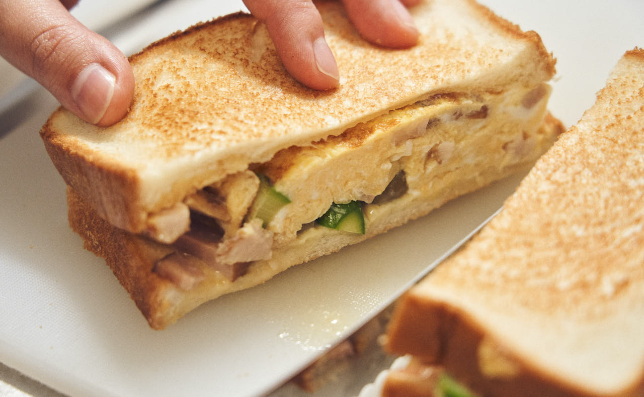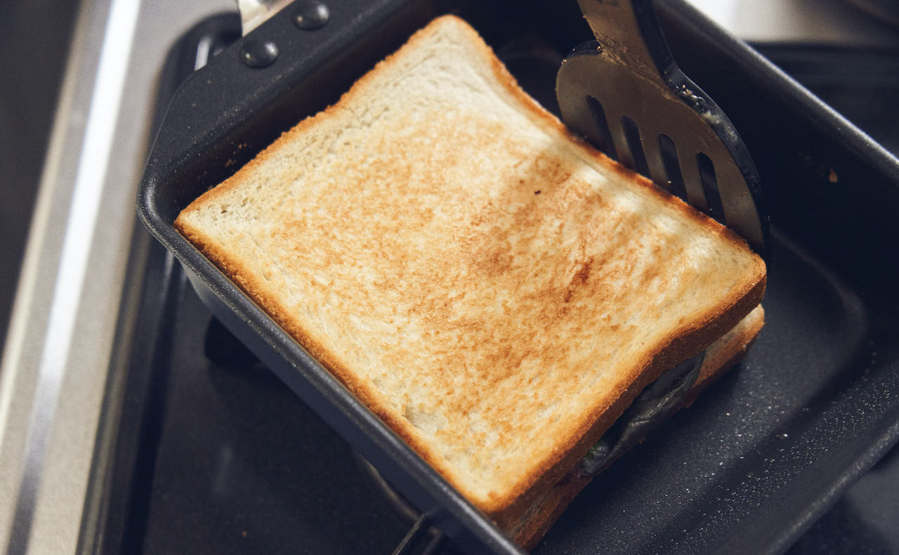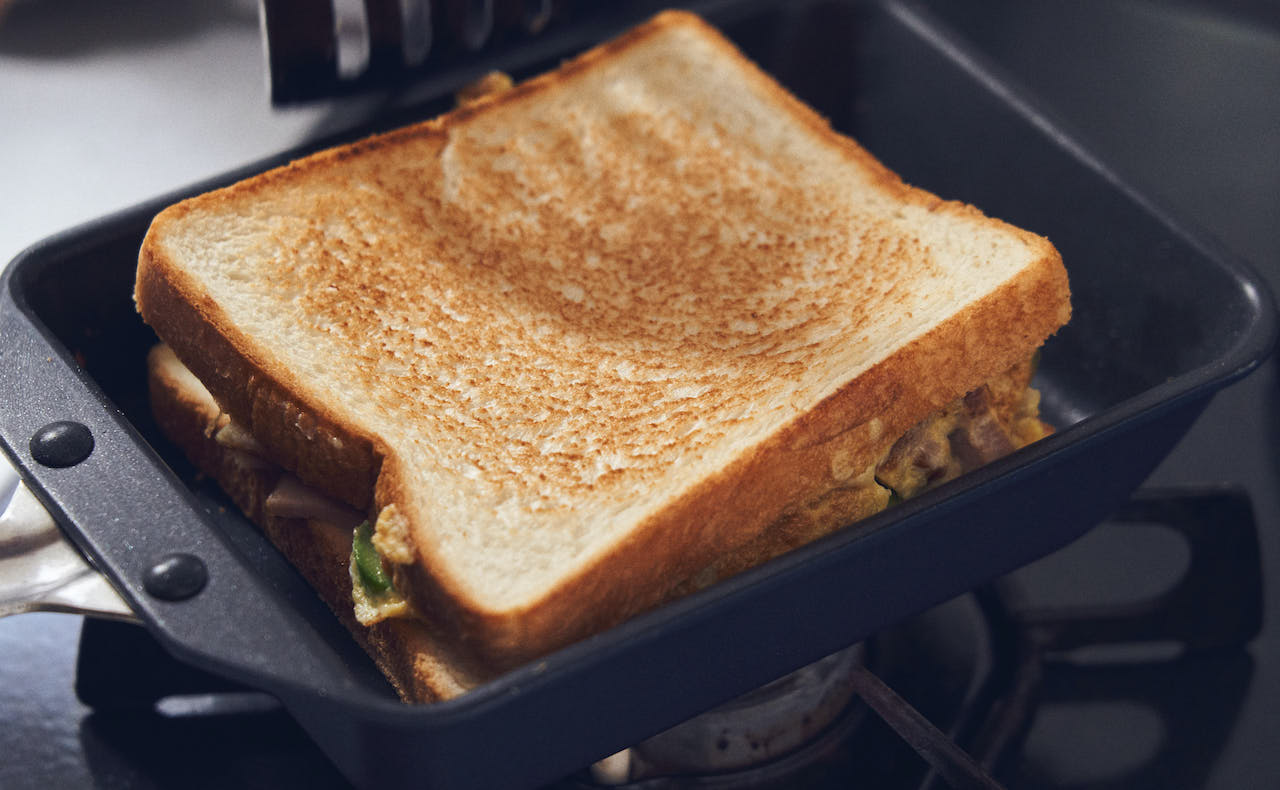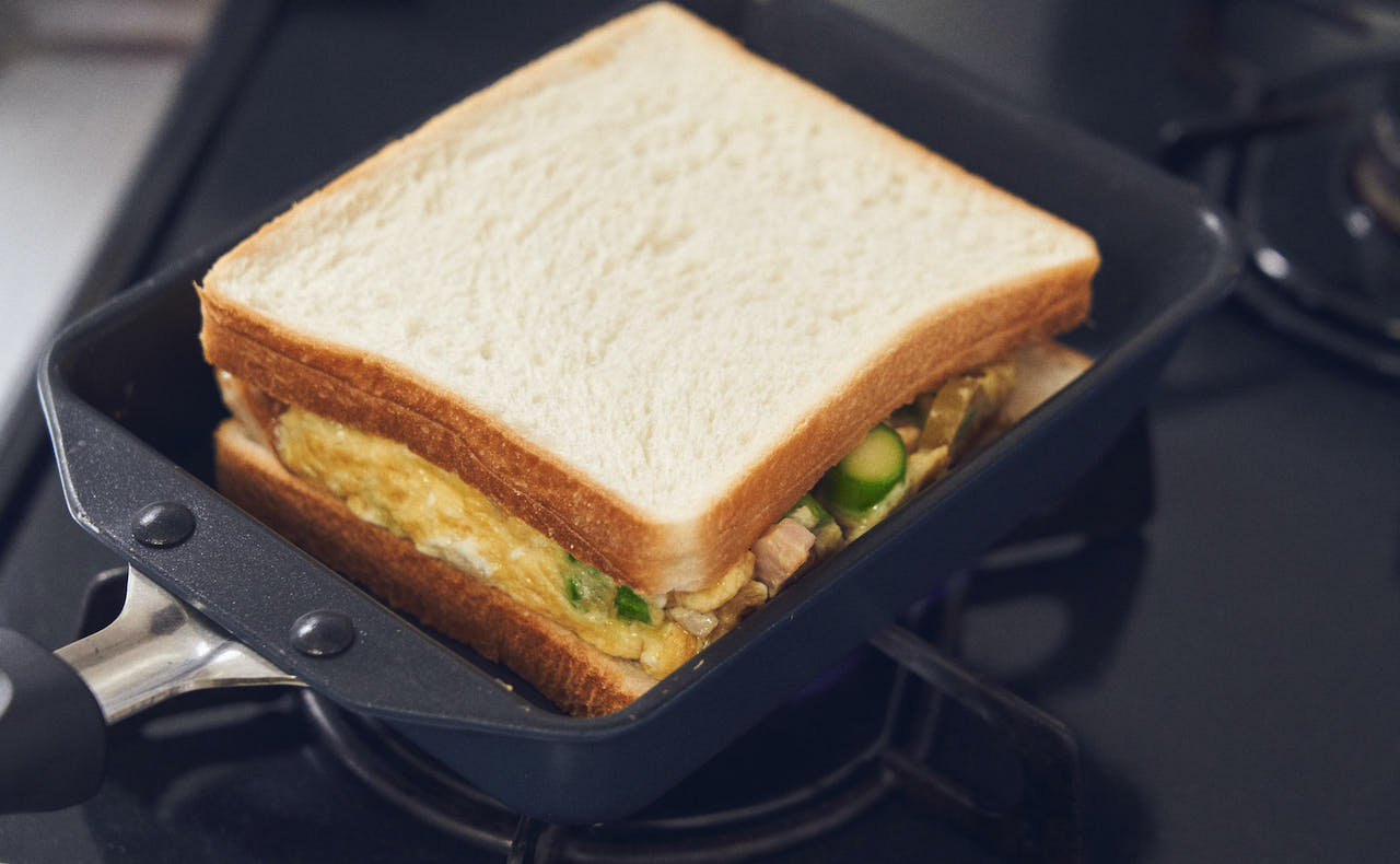 そんなホットサンド作りには、実は玉子焼きフライパンが大活躍! 具材を炒めて、食パンをプレスする工程がフライパンひとつであっという間にできちゃいます。