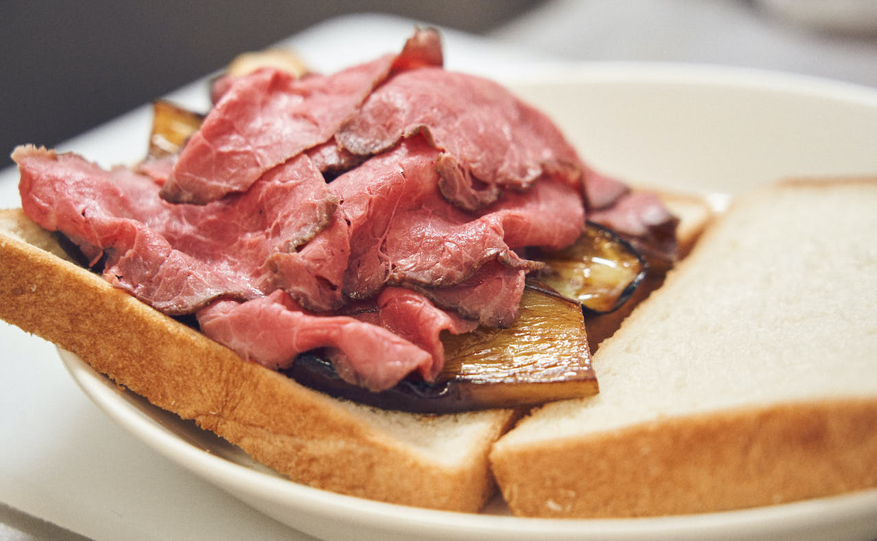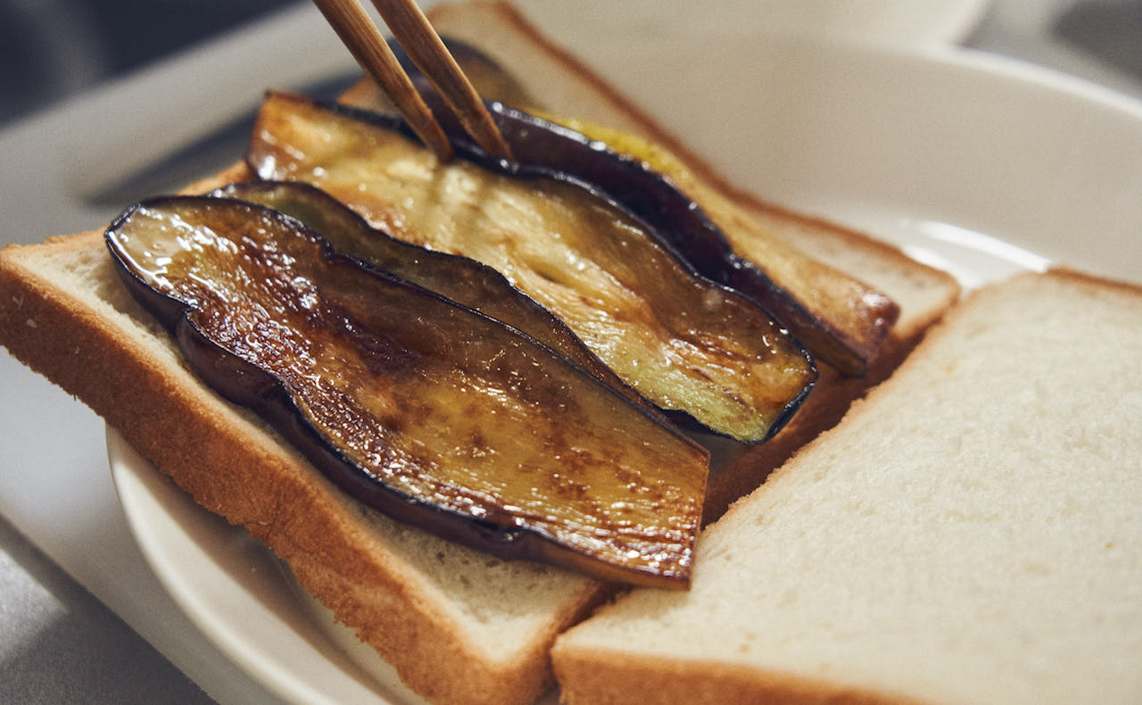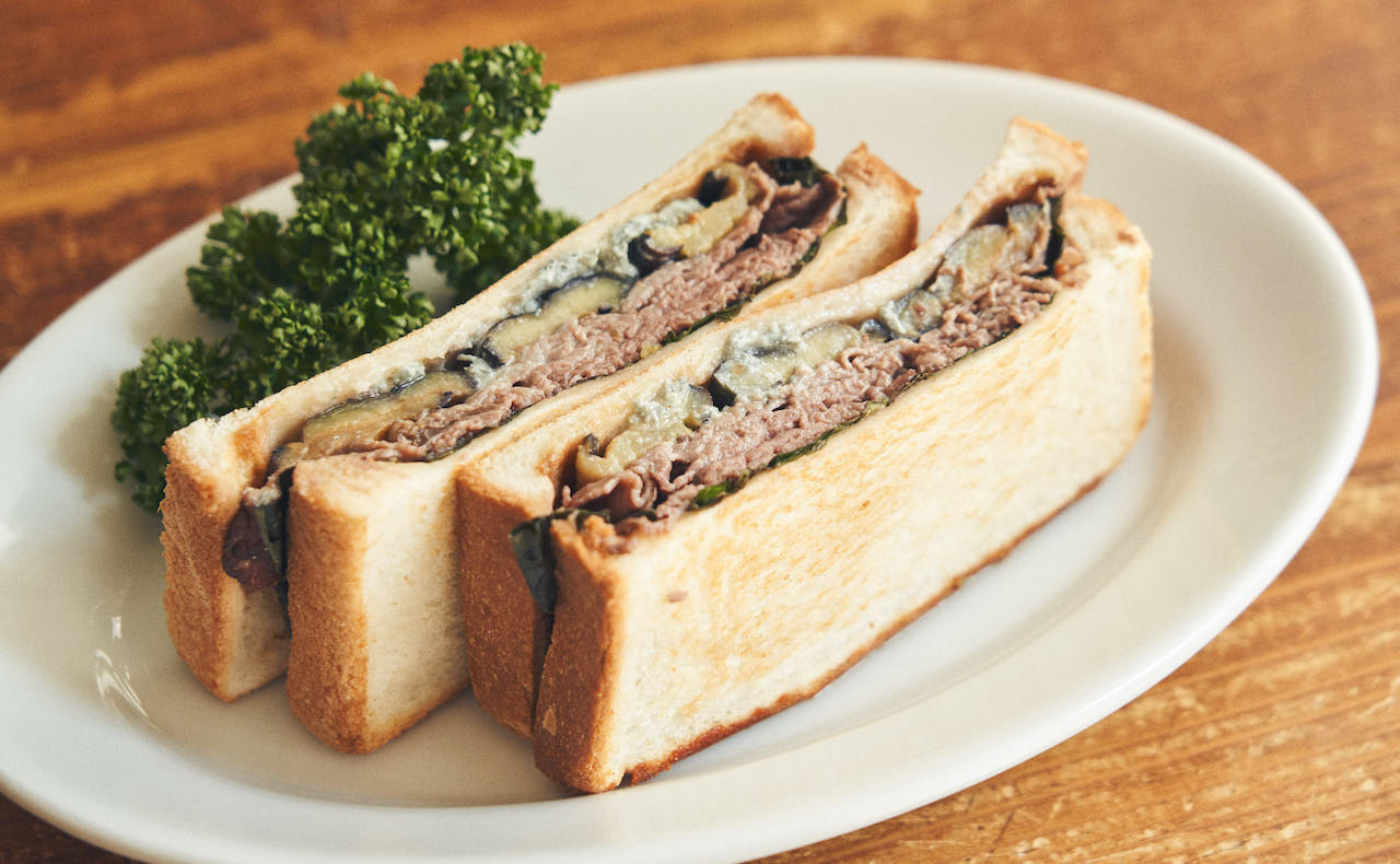 市販のローストビーフをいっそうおいしく食べてもらいたくて、ナスに油を吸ってもらうことでジューシーな食感に仕上げました。そこにブルーチーズ、バジルの葉、バルサミコ酢、粒マスタードを合わせることで、香りもよくて味のバランスがいいホットサンドが楽しめますよ!