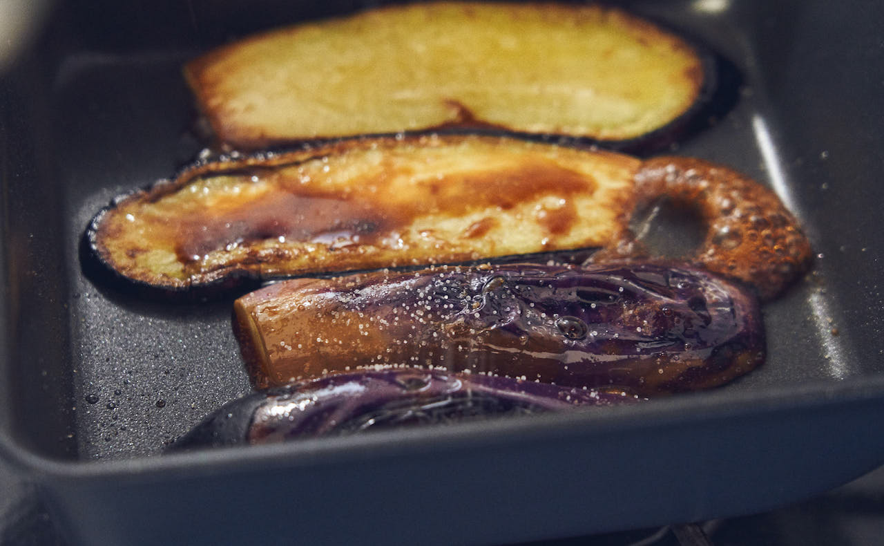 1) オリーブオイルを入れて熱したフライパンに、縦に4枚に薄切りにしたナスを皮目から入れる。両面に焦げ目がつくまで焼き、塩を振ってからバルサミコ酢を加えて煮詰める。