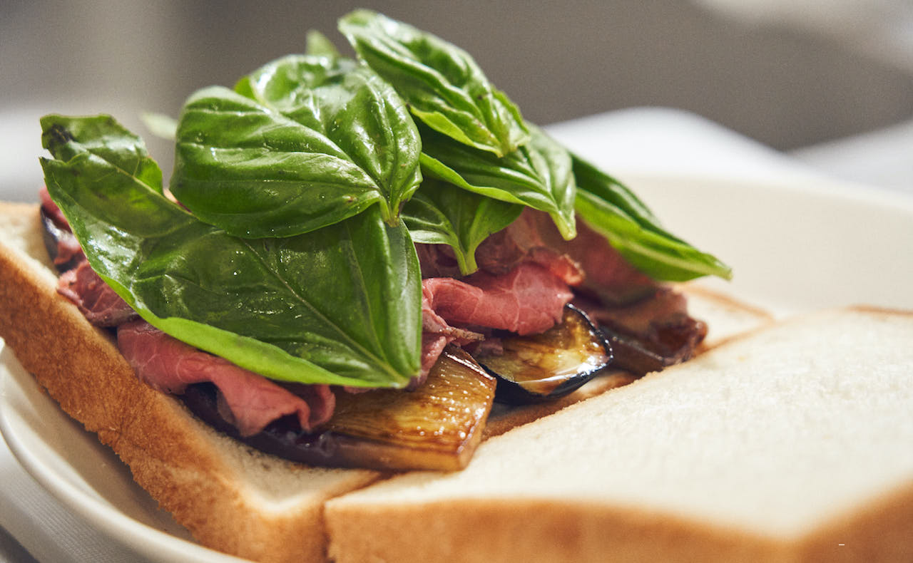 2) 食パンの中央にブルーチーズをちぎって乗せ、そこに1のナス、ローストビーフ、バジルの葉を順に乗せていく。バターと粒マスタードを塗ったもう一枚の食パンとサンドする。