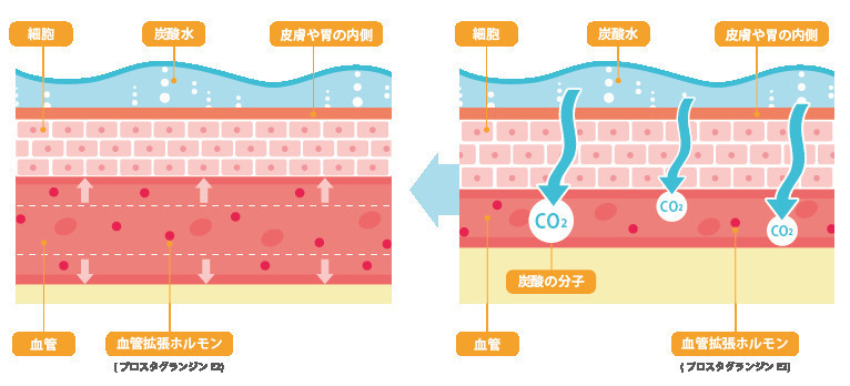 炭酸水は、二酸化炭素を水に溶かして圧縮したものです。二酸化炭素は分子の状態で存在しているので、炭酸水を飲むと胃の粘膜から二酸化炭素の分子が浸透して血管に入ります。すると、血管拡張ホルモンの「プロスタグランジンE2」が分泌されて、血行がよくなります。