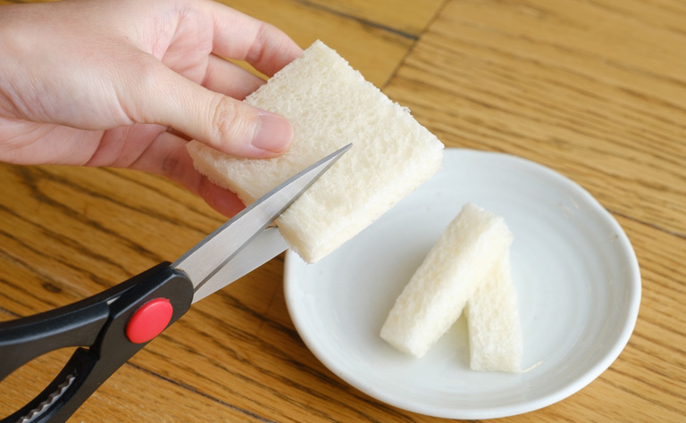 食パンなどやわらかい食材は、調理バサミでスティック状に。包丁とまな板を使わなくて済むので、後片けもパパッとできていいですよ!
