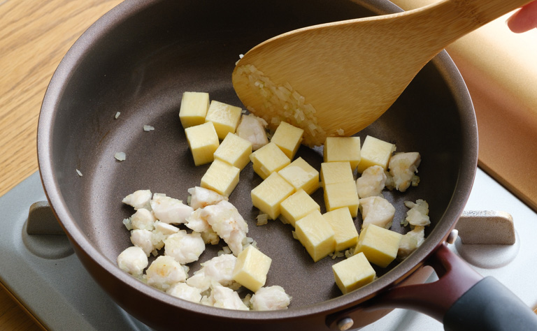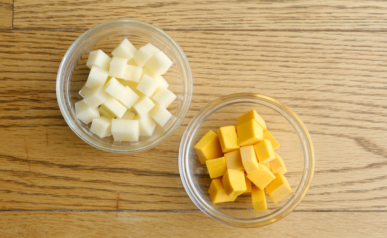 ▲じゃがいもとかぼちゃを使う場合も、さつまいもと同じ1㎝の角切りに