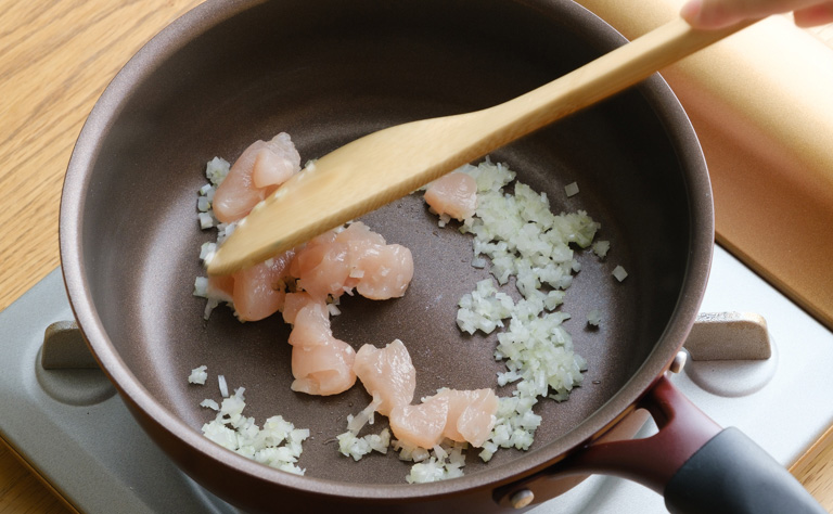 【1】鍋にオリーブオイルを熱し、鶏ささみ、玉ねぎを入れ、中火で炒める。