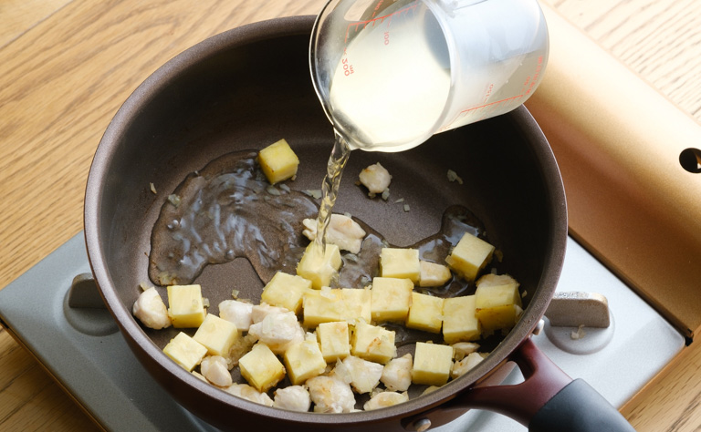 【2】肉に火が通ったら、さつまいもを加え、サッと炒める。