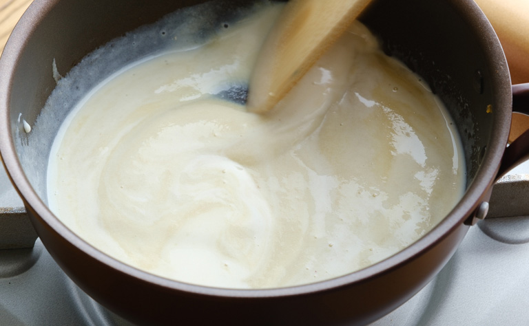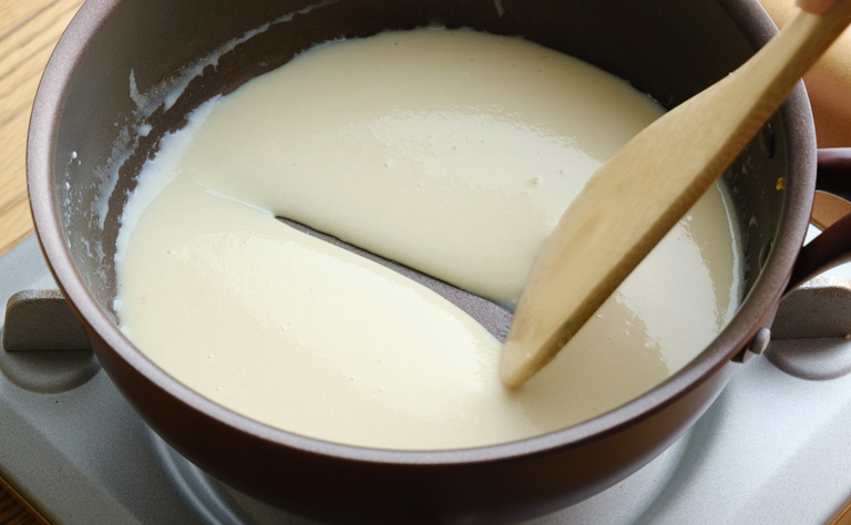 【5】4を鍋に戻し入れ、牛乳、ブロッコリー、コーンを加え、弱火~中火で混ぜながら温める。