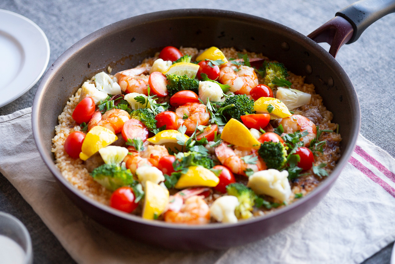 フライパンひとつで作れる! 豚肉とえび、冬野菜の彩りパエリア
