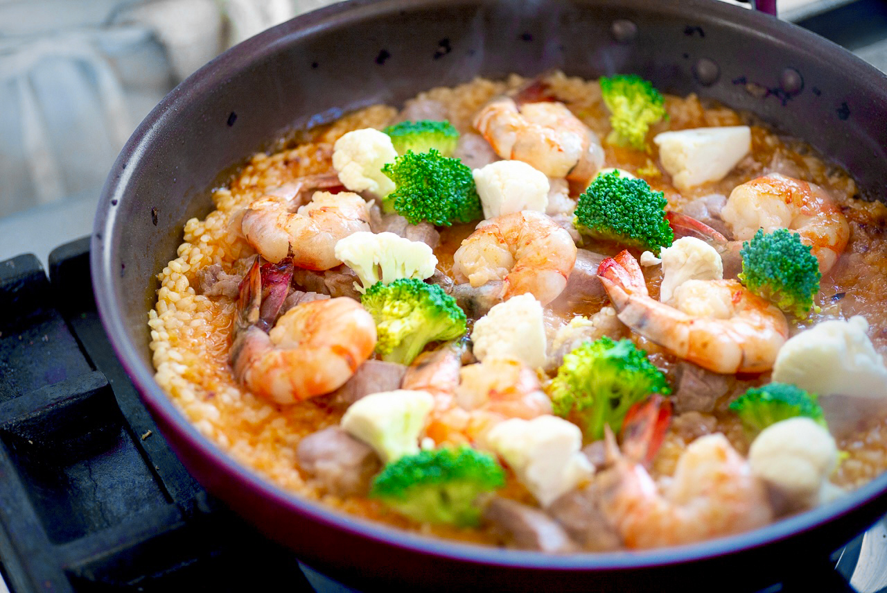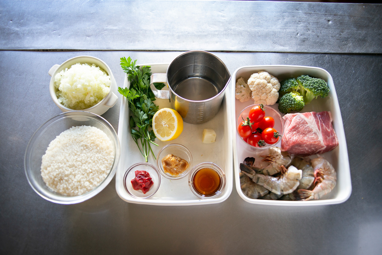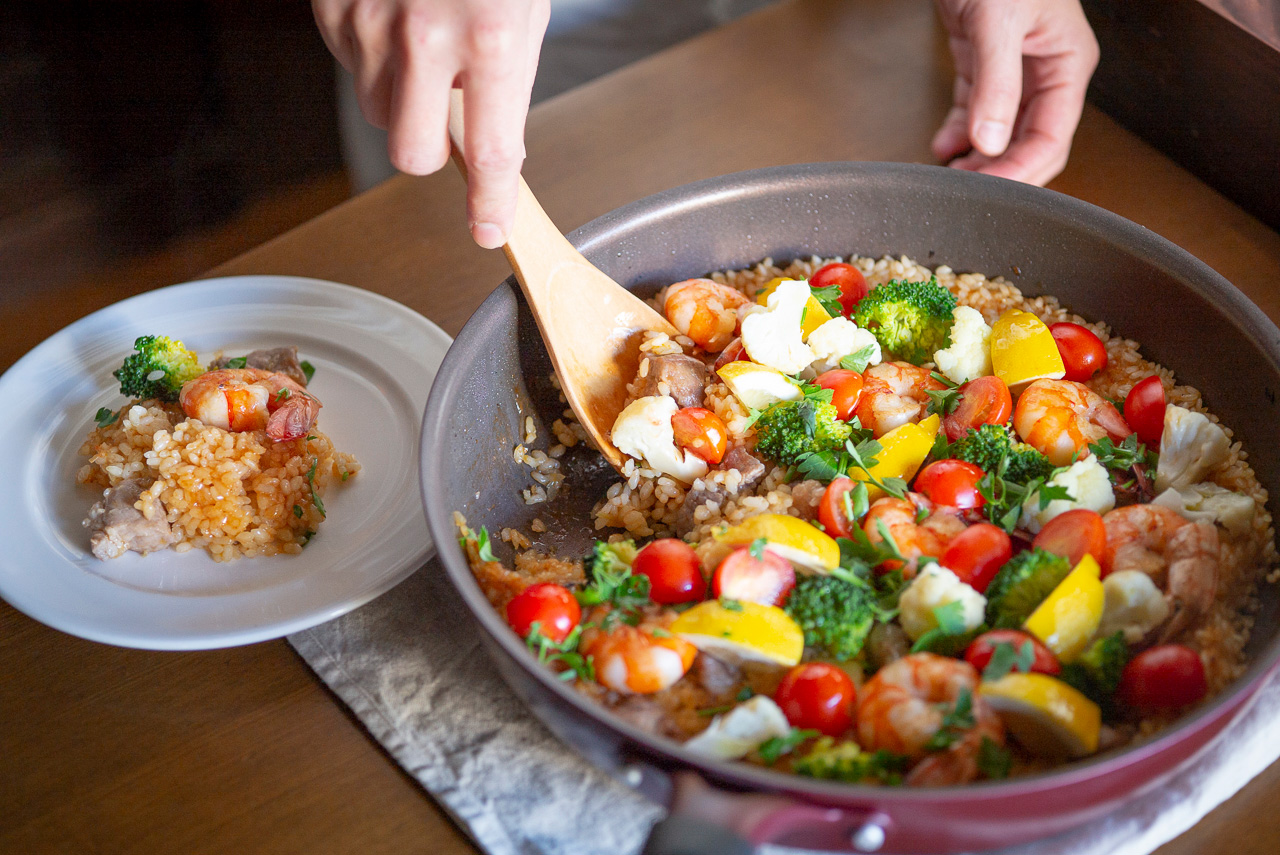 パエリアというと魚介のイメージが強いかもしれませんが、山の幸と海の幸、両方のエキスを取り入れると、うまみの幅がぐっと広がります。今日はえびと豚肉を使っていますが、あさりや鶏肉などを使っても! その時々で好きな具材を合わせてみてださいね。