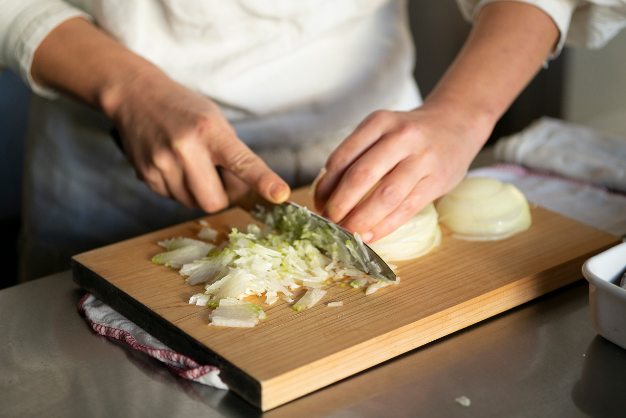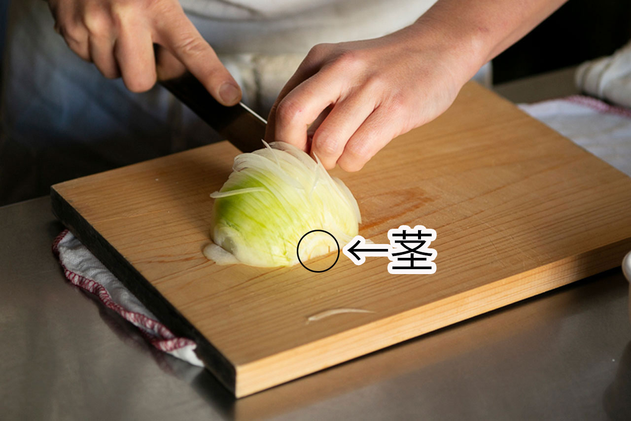 【2】薄くスライスした玉ねぎを3等分して横に置き、1セットずつ端から細かく刻む。