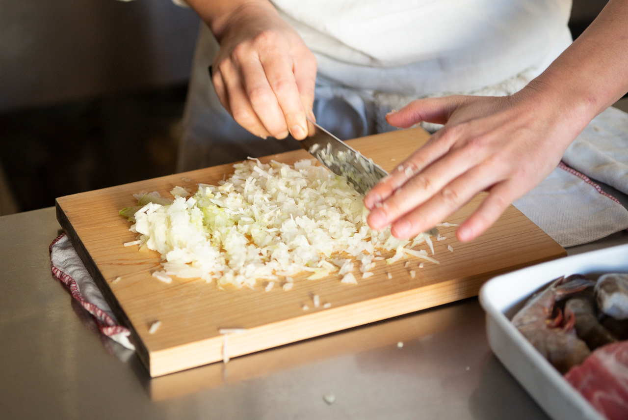 玉ねぎのみじん切りにはコツがあります。縦・横それぞれに切り込みを入れて、刻んでいく方法がよく知られていますが、横に切り込みを入れなくても作れるんですよ。パエリアを作る前に簡単な方法を伝授しますね。