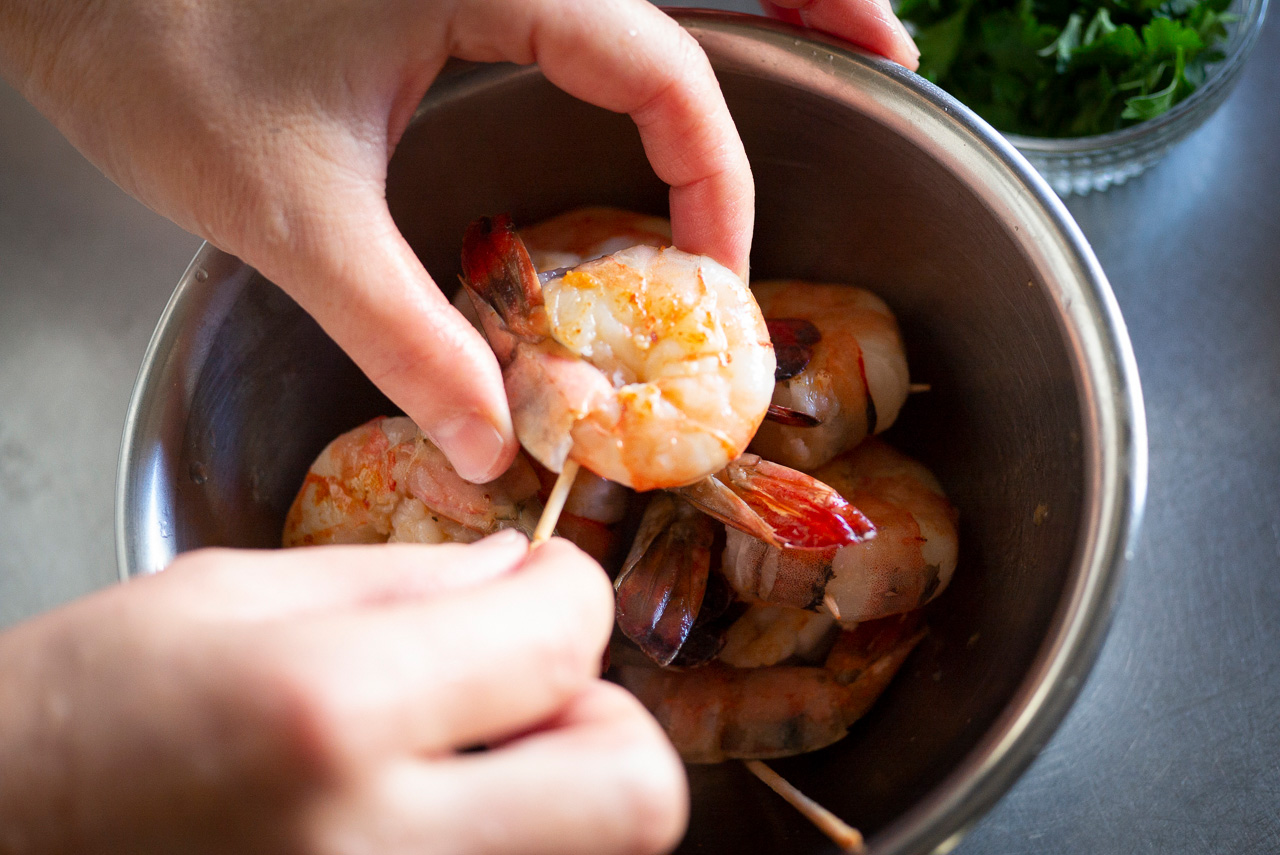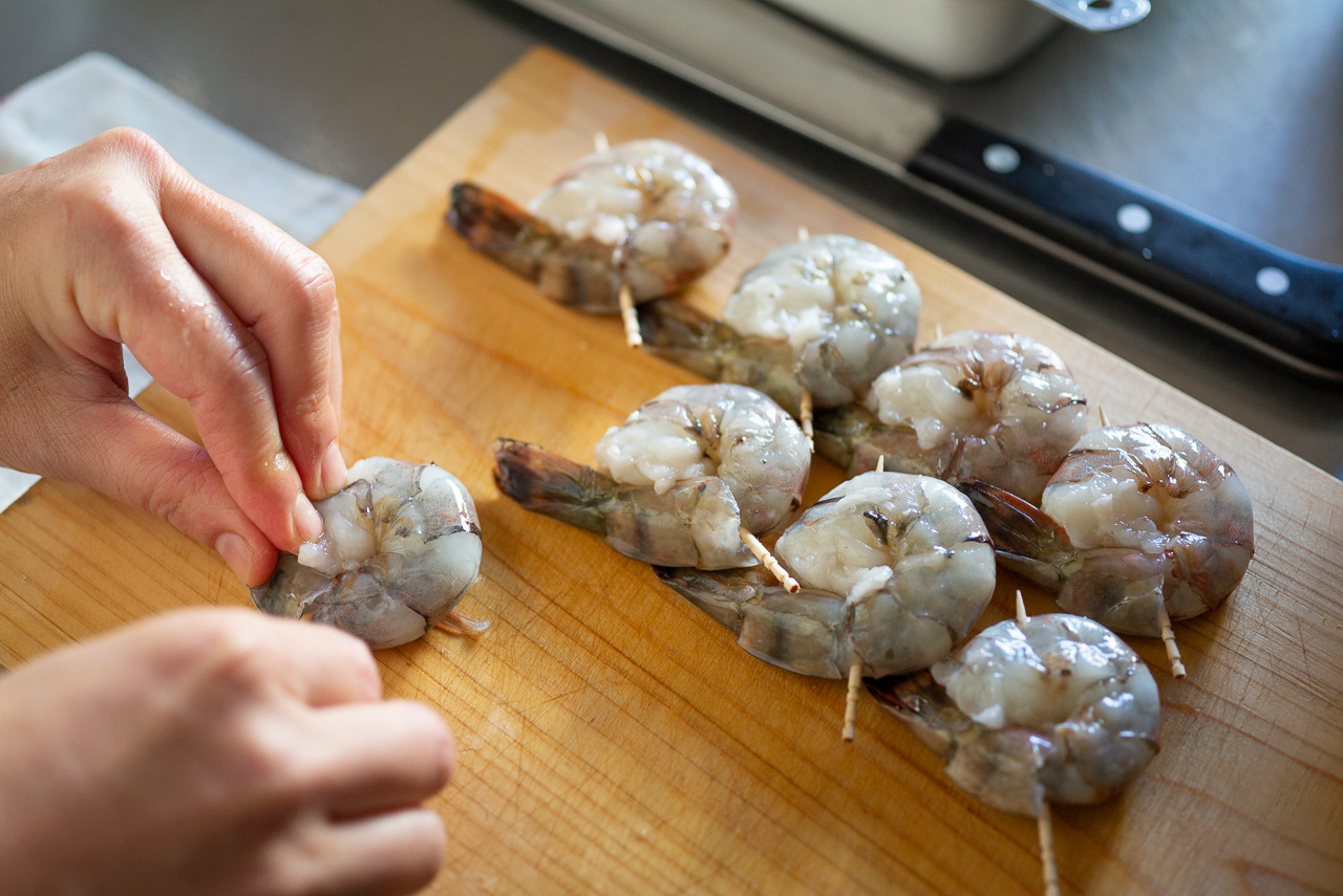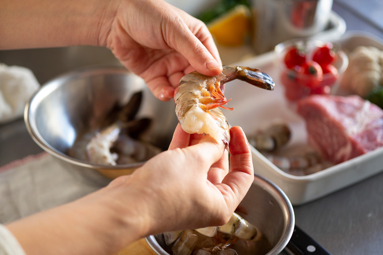 えびは、殻がない方が食べやすいので、調理の時点でむいちゃいます。まぶすお酒は、塩が添加されている料理酒よりも、お米だけで作られた清酒がおすすめ。カップ酒などの廉価なものでも大丈夫です。素材のうまみをぐっと引き出してくれるんですよ。