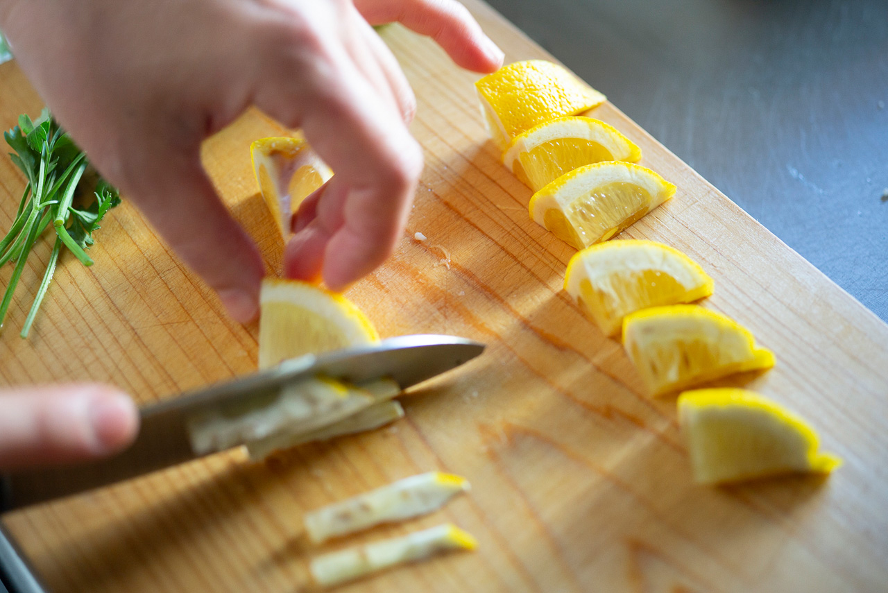 レモンはほかの具材と同様、パエリア全体に散りばめたいので、小さめにカットします。果芯の部分をカットしておくと、絞りやすくなるんですよ。